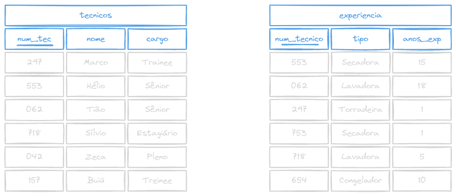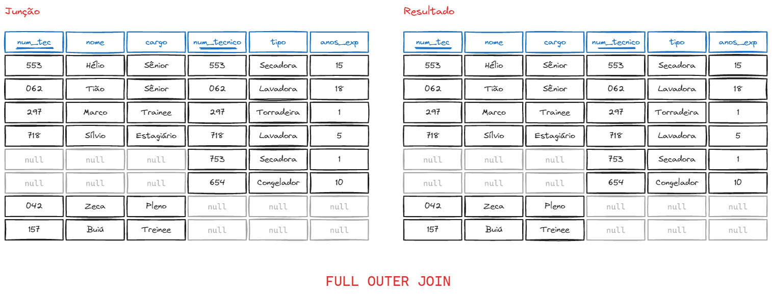 SELECT * FROM (tecnicos NATURAL JOIN experiencia);Repare que não precisamos passar a condição de junção com ON, já que ambas as tabelas possuem a coluna tipo.